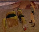 Because of the side car Lara can only mount it from the right side. The motorcycle has no reverse gear, so to drive backwards Lara has to pull it back bit by bit using her muscles.