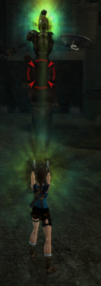 The Petrifying Beam is a glowing beam of green light, which turns Lara into stone. When Lara is turned into stone, the Centaur Bosses will kick her.